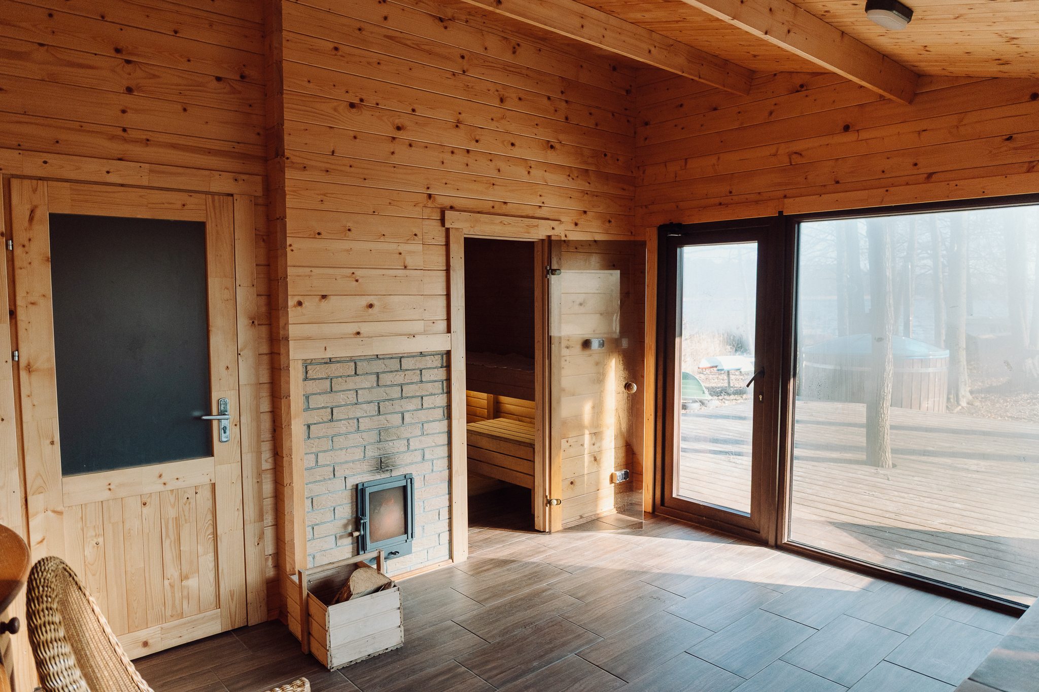 Zaledwie kilka kroków od brzegu jeziora znajduje się nasza strefa relaksu – przestronna sauna i bania z hydromasażem, usytuowane na drewnianym tarasie z pięknym widokiem na wodę.
